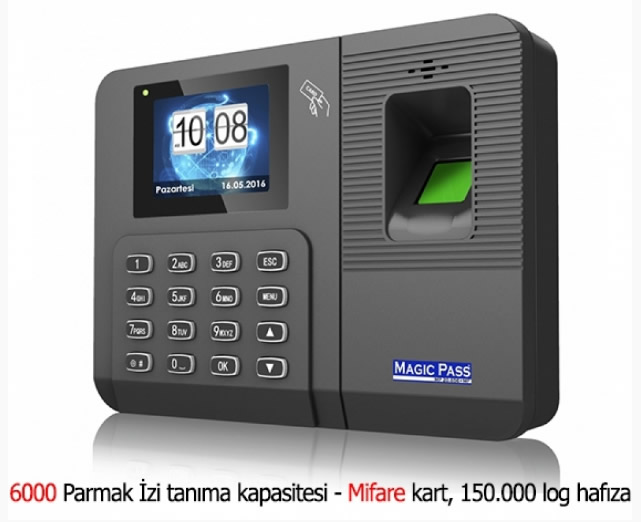 MAGIC PASS 20656 MF Parmak İzi Okuma Terminali, 2,4 renkli, TFT ekrana sahiptir. Parmak izi okunduğunda renkli ekranında kullanıcı adını gösterebilir ve bu ekran 80.000 gerçek canlı renklirdir. Parmak izini 0,2 gibi kısa bir sürede okuyabilen bu cihaz ile 6000 adet parmak izi kaydı yapılabilmektedir. Ayrıca parmak izinin yanı sıra şifreli veya mifare kartlı geçişler de yapılabilmektedir. Bu cihaza parmak izinizini okuttuğunuzda cihaz sesli ve Türkçe olarak teşekkür ederek bilgilendrme de yapmaktadır.